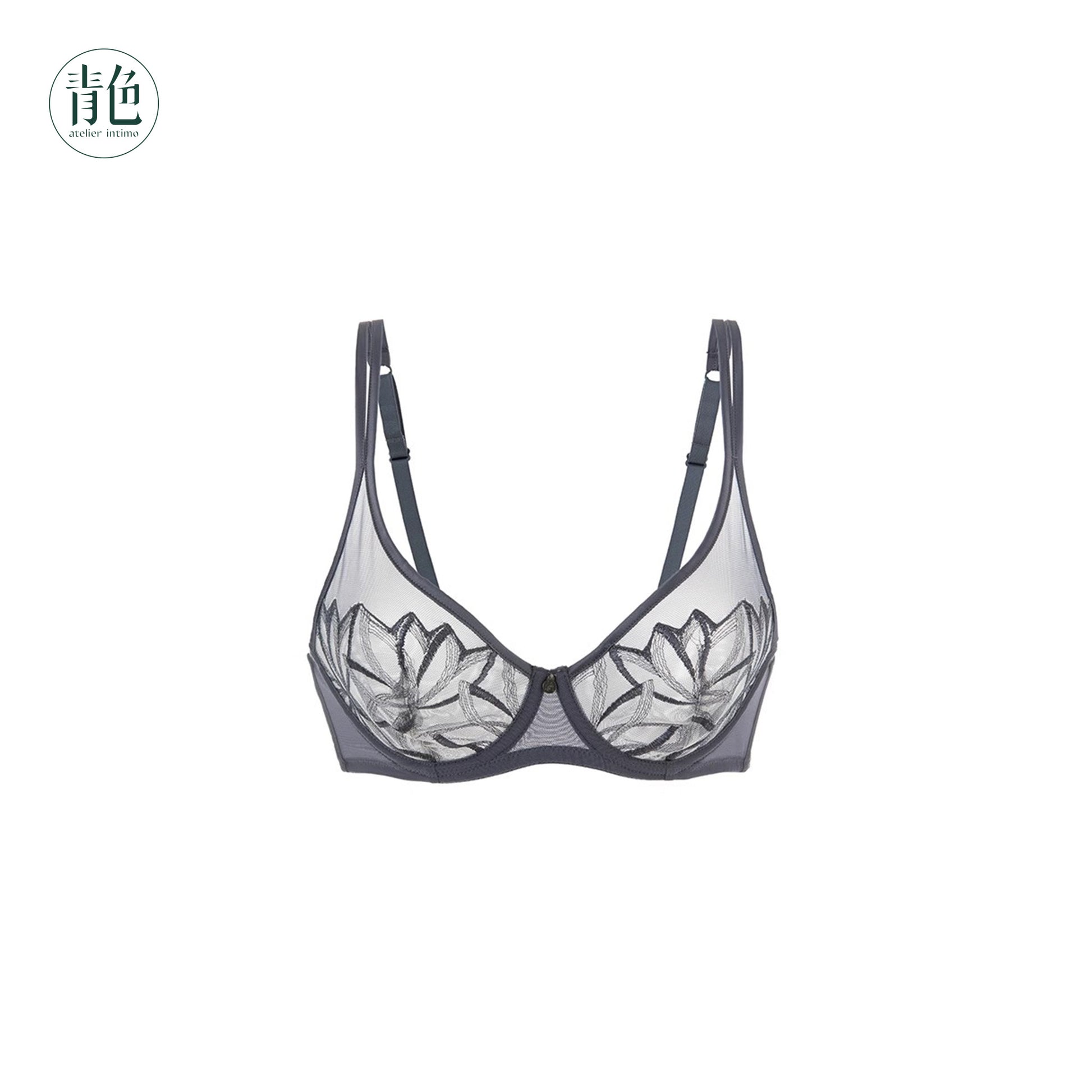 来自法国Broderies Deschamps的刺绣蕾丝,图案如清晨木槿满枝花开。双色绣线虚实又立体,绚丽又温柔。高弹网纱覆木槿花蕾丝凹凸立体形状点缀胸型。配立体双细肩带及捆碗优雅承托住罩杯,隐藏式钛合金记忆钢圈完美贴合胸型。中国传统色灰蓝,粉白,清丽优雅。