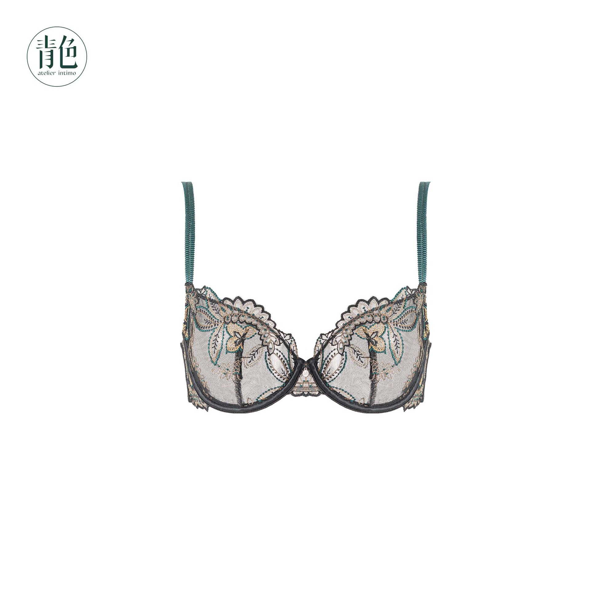 The 3/4 cup is crafted with black sheer mesh embroidered using peacock blue and gold threads in varying thicknesses to depict delicate bird feather patterns. Multi-technique embroidery creates dimensional lace with irregular edges, while the inner lining of lightweight, non-stretch mesh ensures a refined and luxurious finish. Dual slim straps in matching embroidery shades and satin-trimmed edging complement the titanium memory underwire, which adapts to body temperature for natural curve-hugging support and shaping.