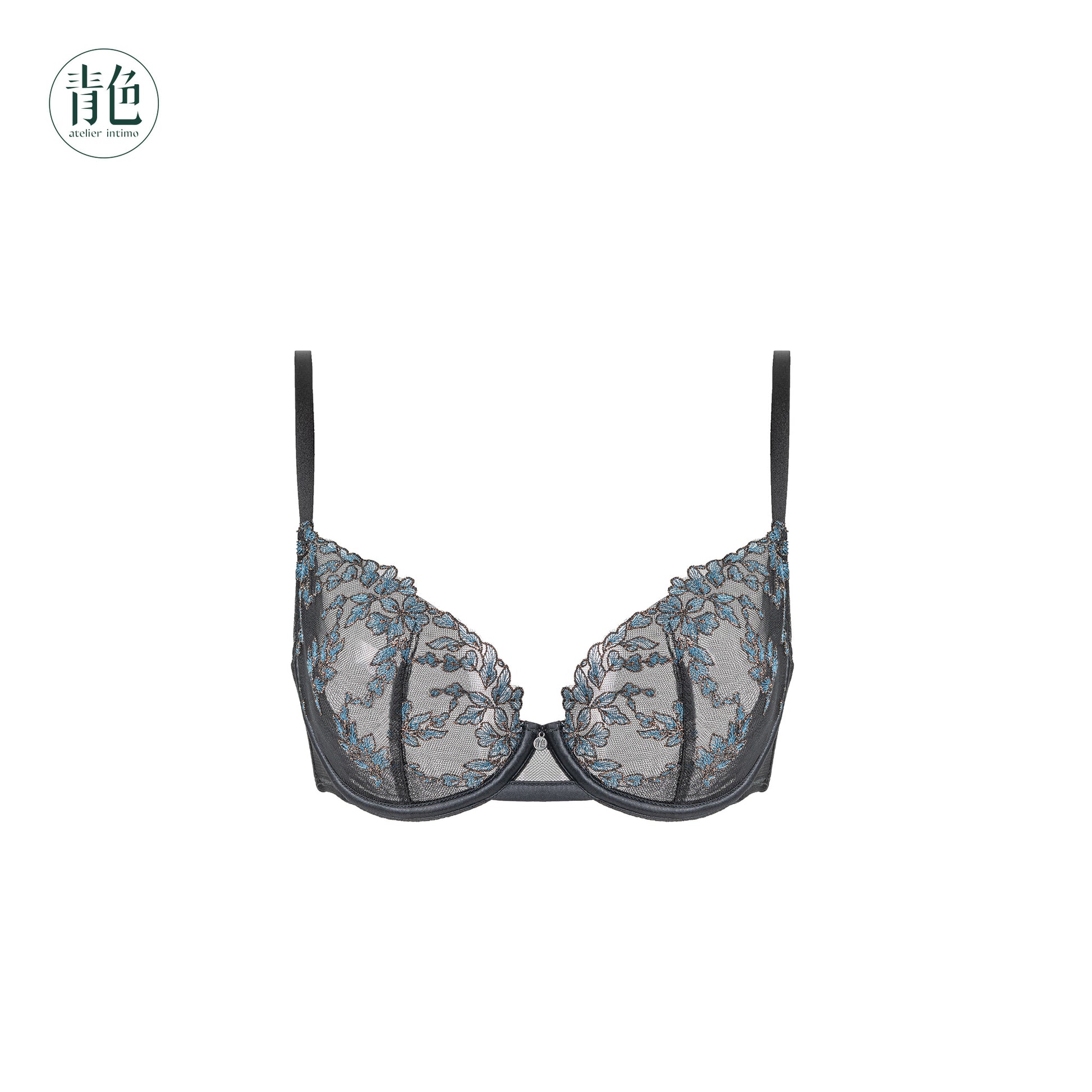 3/4罩杯,采用西班牙黑网纱蓝色花瓣刺绣,并勾勒金线似翠鸟羽毛斑点而引用中国古代手饰工艺中的“点翠”。黑色色丁包边工艺含钛合金记忆钢圈贴合身型,舒适塑形。 蓝色花瓣不规则散落的图案及不规则花边,优雅诗意。